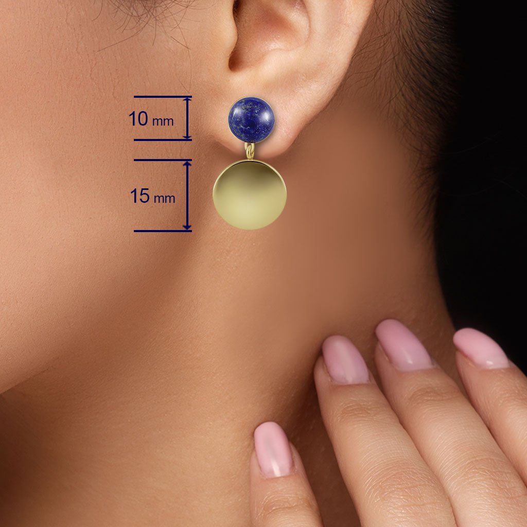They are made of special fine alloy brass for jewelry and plated in exclusive 18K gold of high wear resistance. They measure 2,8 cm length. This design consists on a 15 mm diameter circular motif and 1 cm lapis lazuli cabochon. Push back clasp